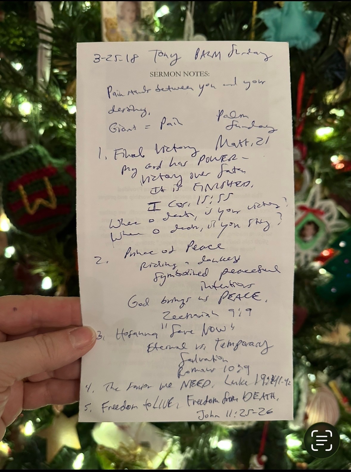 I was preparing for Christmas this year, searching for a certain Christmas stocking to hang on our mantle. It was the stocking for our 12-year-old granddaughter, Amelia—a stocking she’s used since she was three. It was important to me, and I began to grow a bit anxious when it wasn’t where I thought it should be. I began going through my tubs for the third time, determined to find it, and as I was searching, I found something unexpected, an old bulletin from 2018 when Tony was the interim senior pastor for Westfield Friends Church in Westfield, Indiana. It was from March, 25th , Palm Sunday. I stopped my anxious activity and took five minutes to pause and read over my notes from that Sunday, and I was encouraged. Five main points declared the very truth my heart and spirit needed, reminding me that I have victory in this life and the next and Jesus is my peace: